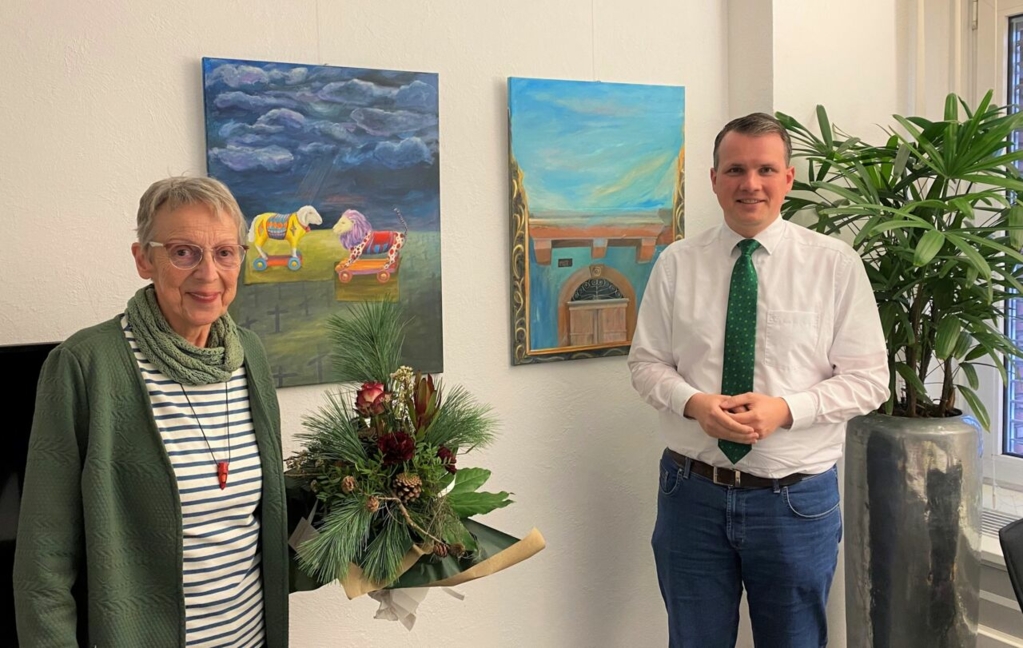 Im Gespräch mit Bürgermeister Tobias Stockhoff hat Marie-Luise Stötzel auch ihren künstlerischen Werdegang geschildert. Die Leidenschaft fürs Malen ist ihr quasi in die Wiege gelegt worden. Es war ihr Vater, der „mit sehr viel Liebe“ gemalt und gezeichnet hat -und der seiner Tochter schon früh wertvolle Tipps gab. Nach dem Studium der Kunstpädagogik in Gießen hat sich Marie-Luise Stötzel stets in verschiedenen Kursen fortgebildet, etwa an der Europäischen Kunstakademie in Trier. Sie ist Mitglied im Dorstener Kunstverein „Virtuell Visuell“, im Hamaland Kunstkreis und Mitbegründerin der Raesfelder Kunstgruppe „dasselbe anders“.