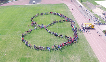 Kirchhellen - Das Vestische Gymnasium Kirchhellen hat sich in diesem Jahr ein ganz besondere Aktion einfallen lassen, um seinen Festwagen für den Brezelumzug zu dekorieren. Während des Sportfestes an der Loewenfeldstraße formierten sich die Schüler und Lehrer der Kirchhellener Schule zu einem Riesenbrezel. Das beeindruckende Foto entstand mit Hilfe einer Drohne.