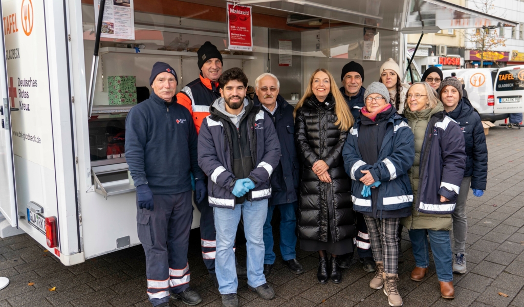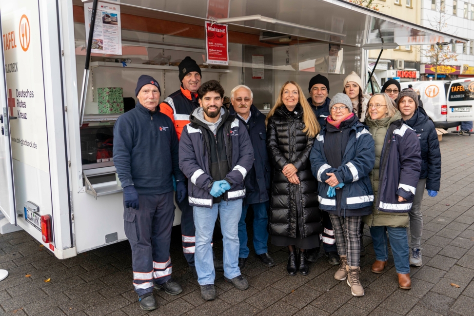 „Es ist beeindruckend, wie gut und schnell die Kundinnen und Kunden der Tafel versorgt wurden. Rund 90 Menschen kommen in der Regel während der zweistündigen Standzeit am Markt vorbei. Bei der Ausgabe versuchen die Ehrenamtler:innen auf individuelle Wünsche und Unverträglichkeiten zu achten“, so Bürgermeisterin Bettina Weist. Wilhelm Walter, Vorsitzender des Präsidiums des Kreisverbandes Gladbeck, informierte im Rahmen des Besuchs zur Jahresbilanz der geleisteten Hilfe und Arbeit, die von der Stadt aus Mitteln des Stärkungspaktes des Landes unterstützt wird. Besonders in Zeiten steigender Lebensmittelpreise ist die Unterstützung für viele Menschen enorm wichtig: 840 Bedarfsgemeinschaften mit insgesamt 1.870 Personen, darunter Alleinstehende und Familien, sind aktuell als anspruchsberechtigt registriert. Bürgermeisterin Bettina Weist: „Für dieses wichtige Engagement danke ich allen Beteiligten herzlich. Nicht nur bedürftige Gladbecker:innen konnten so unterstützt, sondern auch innerhalb eines Jahres rund 390 Tonnen Lebensmittel gerettet werden.“
