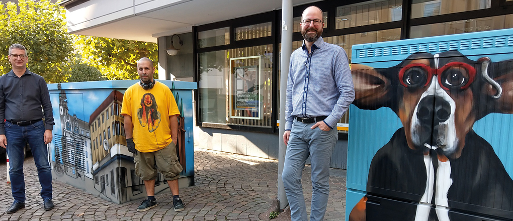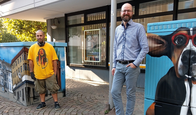 Gladbeck - Ganz begeistert von der künstlerischen Gestaltung von zwei Stromkästen am Goetheplatz zeigten sich Matthias Alt und Georg Hahne von Optik und Juwelier Hahne auf der Hochstraße in der Innenstadt.