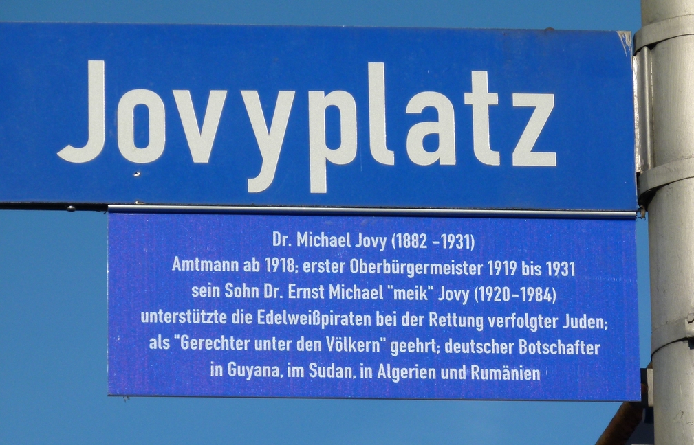 Die Idee zur Umwidmung und zur Anbringung der Erklärungsschilder stammt von Heinz Enxing vom Verein für Orts- und Heimatkunde, der auch die neuen Schilder besorgte. Damit wird die Erinnerung an Dr. Michael Jovy, den ersten Oberbürgermeister der Stadt, und seinen Sohn Dr. Ernst Michael Jovy, Widerstandskämpfer gegen das NS-Regime und späterer Diplomat, sichtbar gewürdigt.