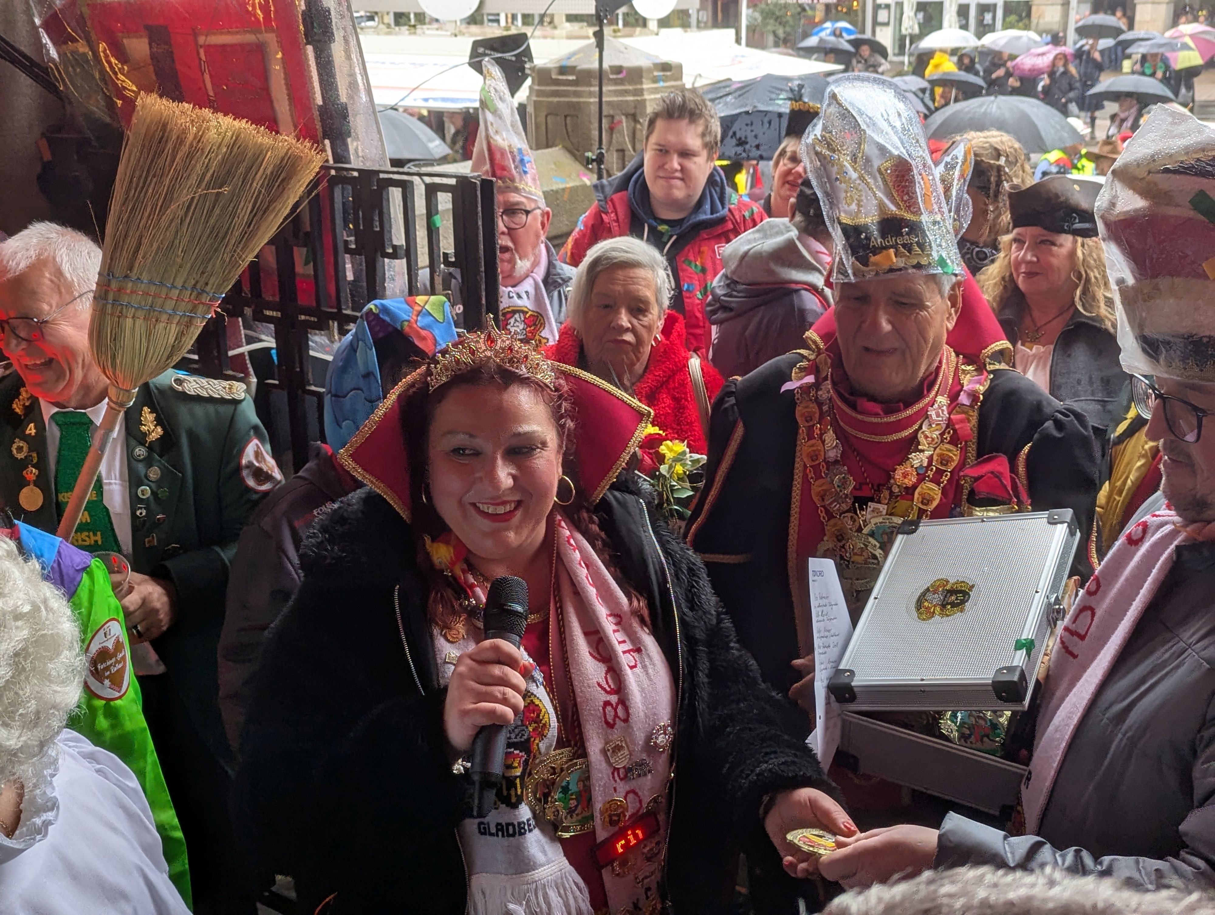 Nach kurzer „Verhandlung“ überreichte Erster Beigeordneter Dr. Volker Kreuzer den Stadtschlüssel an Prinzessin Nicole I., womit die närrische Regentschaft offiziell besiegelt war. Anschließend wurde im Foyer des Rathauses sowie vor dem Alten Rathaus ausgelassen gefeiert, geschunkelt und getanzt.