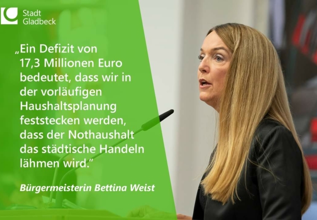 Gladbeck legt einen defizitären Haushaltsentwurf mit einem Minus von 17,3 Millionen Euro vor. Dazu die Bürgermeisterin: „Wir haben den Entwurf bereits in den Vorjahren in sehr schwierigen Zeiten eingebracht, aber durch die Bilanzierungshilfe und viele Einsparungen und