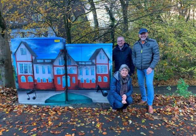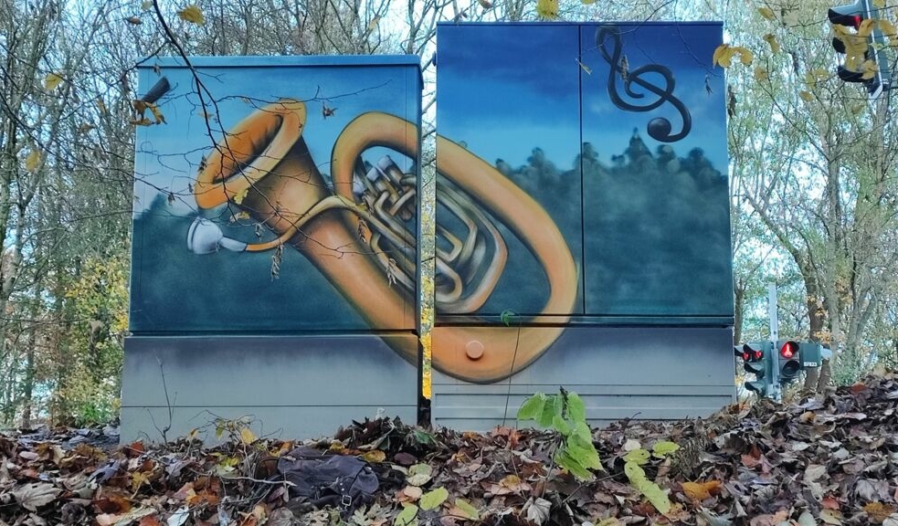 Auf zwei größere Kästen in der Nähe der Musikschule, auf der Europabrücke, wurde das denkmalgeschützte Musikschulgebäude, Notenschlüssel und eine Tuba aufgesprüht. Trotz knapper Zeit wegen Konzertvorbereitungen vor Weihnachten und Unterricht schaute auch Musikschuldirektor Rolf Hilgers vorbei und freute sich über die schönen Motive, die er vorgeschlagen hatte. Das Team Müzeyyen Dreessen vom Freundeskreis Gladbeck-Alanya und Werner Hülsermann von der Siedlergemeinschaft Rentfort versuchen noch vor dem Kälteeinbruch einige Kästen durch das Graffitikünstler Duo Maurizio Bet und seine Freundin Christiane Roewer, die sich unter dem Namen „GRAFFWORKS“ zusammengeschlossen haben, gestalten zu lassen. Ein Dank geht diesmal an die Stadt Gladbeck, die die Genehmigung für die Gestaltung erteilt hat.