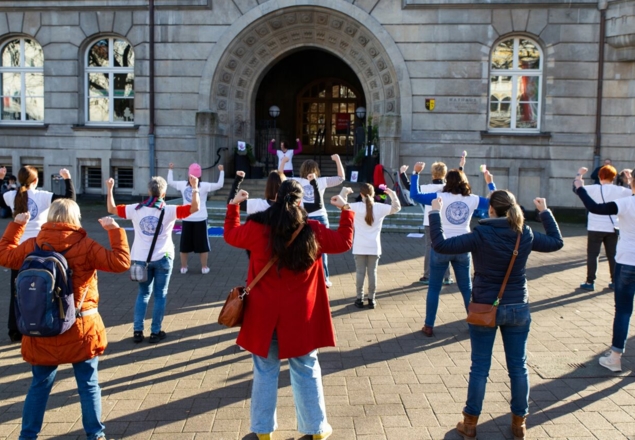 Mit Unterstützung der Stadt Gladbeck haben die Soroptimistinnen (aus dem lateinischen für beste Schwestern) des SI-Clubs Gelsenkirchen/Ruhrgebiet dazu aufgerufen, den Mut zu haben, das Schweigen über Gewalt zu brechen und solidarisch für Freiheit und Selbstbestimmung von Frauen und Mädchen auf- und einzustehen. Unterstützt wurden sie in diesem Jahr von den Taiko-Trommlern der Gladbecker Sportgemeinschaft. Auch sie haben an diesem Vormittag lautstark ein Zeichen gesetzt. Für einige Frauen ist dieser Flashmob eine Art Befreiung. Zu sehen und erleben war Erleichterung und Leichtigkeit in den Gesichtern der tanzenden Frauen. Viele Bürgerinnen und Bürger blieben stehen und feuerten die Frauen an.