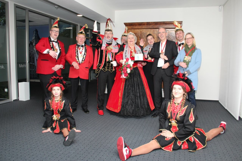 Gut vorbereitet überreicht Bankvorstand Ingo Abrahams eine übervolle Spardose an das Stadtprinzenpaar Volker I. und Tine I. für die vielfältigen Aufgaben. „Wir fördern mit unserem Beitrag die bunte ehrenamtliche Karnevalstradition in Gladbeck“, sagte Ingo Abrahams. Prinz und Prinzessin freuen sich über die Spende. „Die 1.000 Euro kommen der Tanzgarde des KC Wittringer Ritter zugute, um die wertvolle Nachwuchsarbeit durchführen zu können“, sagt der Stadtprinz Volker I.