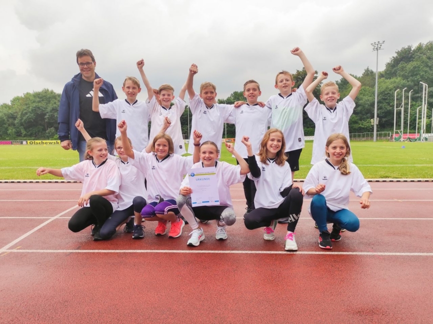 Und das mit Erfolg: Die Gregorschule setzte sich gegen die anderen Mannschaften durch und errang den ersten Platz. Für die ersten beiden Platzierungen geht es nun weiter nach Münster zum NRW YoungStars Klassenwettbewerb Leichtathletik.