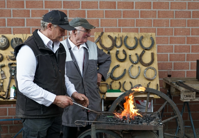 Die Hufschmiede haben fleißig am Schmiedefeuer das Eisen erhitzt und für wahre Unterhaltung gesorgt. Wer wollte, konnte auch ein Hufeisen bemalen und als Andenken mitnehmen. Die Luft war erfüllt von verschiedensten Gerüchen, nicht nur dem vielfältigen Essen, dass die Familie Miermann und Max Hetkämper-Flockert anboten. Holzarbeiten, ob sägen, hobeln oder schleifen, sorgten für frischen Holzgeruch, scharf und metallisch roch es bei den Schweißarbeiten und von den Schmieden zog regelmäßig rauchige Glutluft herüber.
