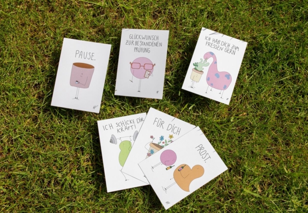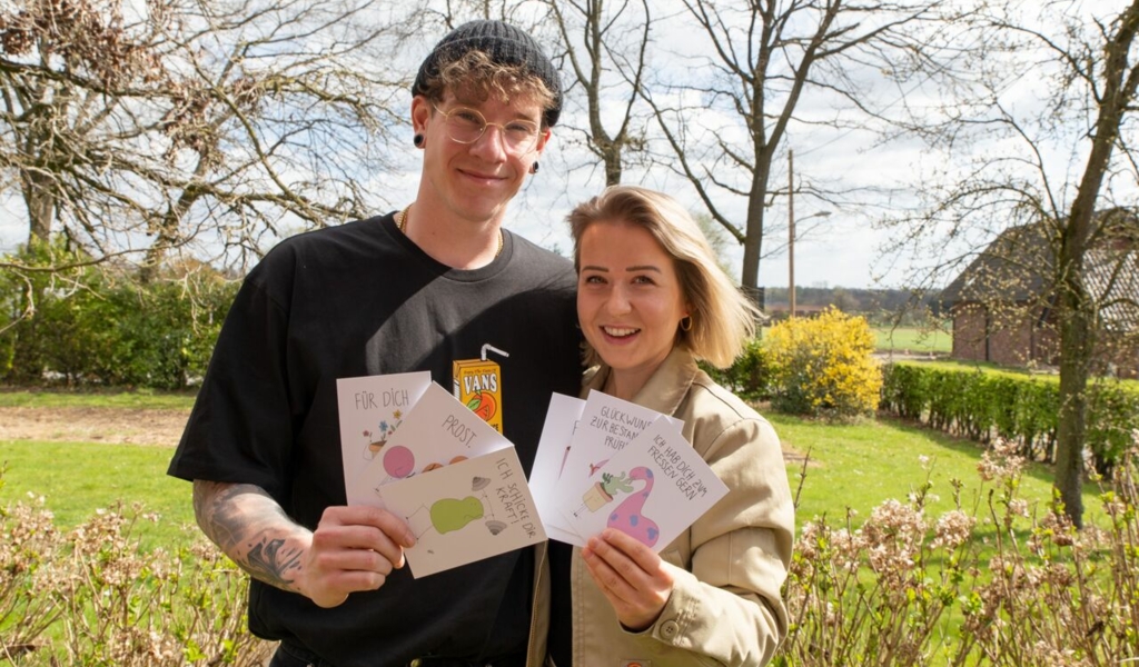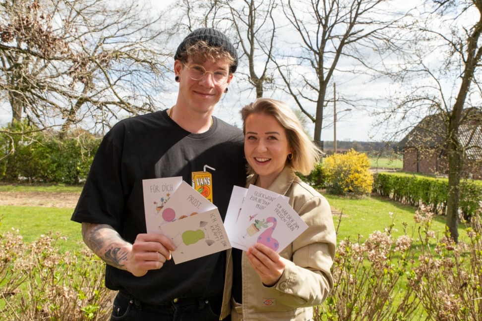 Lokal produzierte Grußkarten finden sich bereits bei Blütenecht, der Humboldt Buchhandlung sowie dem Concept Store Details in Kirchhellen wieder. Auch in Schermbeck konnten sie Bauer Graaf schon von ihrem Konzept überzeugen. Erhältlich sind aktuell acht originelle Motive, die sich jeweils für mehrere Zwecke interpretieren und nutzen lassen. „Wir legen großen Wert auf Nachhaltigkeit, deswegen lassen wir die Produkte direkt im Ort produzieren und entschlossen uns für 100 Prozent recyceltes Papier“, betont Maren Kleczewski.