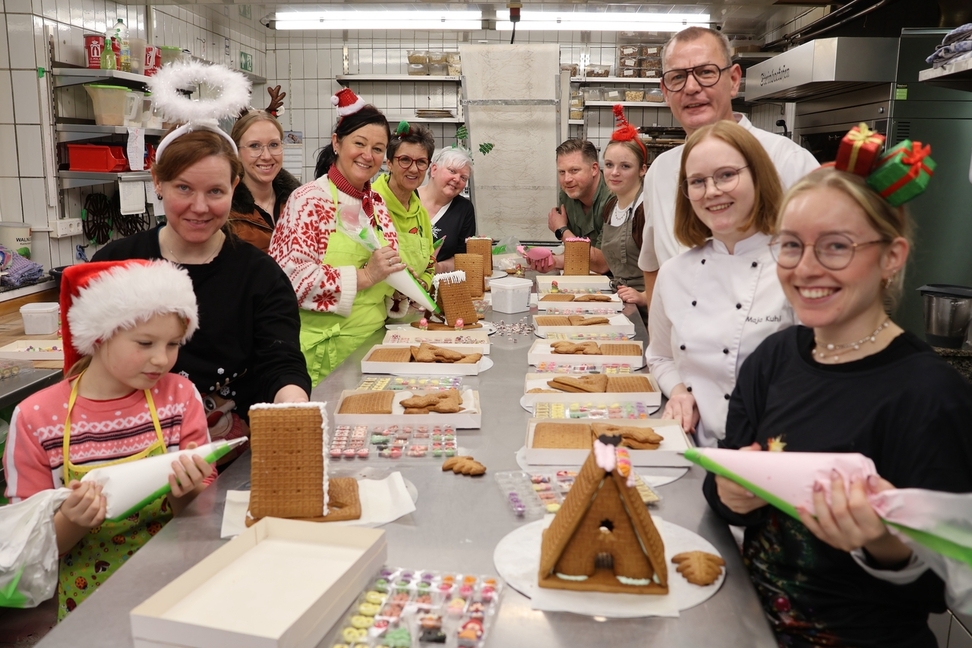 Unter Anleitung der „frisch gebackenen“ Konditormeisterin Maja Kuhl und Backstubenchef Volker Rütter entstanden in Feldhausen kürzlich 15 kreative Lebkuchenhäuschen. Diese werden seit dem 26. November im Kuchenladen (Mittwoch und Freitag 12 bis 16.30 Uhr sowie Samstag und Sonntag 8 bis 16.30 Uhr) oder auf Nachfrage im Gasthof zu 45 Euro pro Stück verkauft.